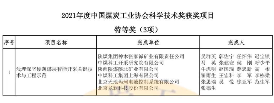 2021年12月10日,中國(guó)煤炭工業(yè)協(xié)會(huì)2021年度科學(xué)技術(shù)獎(jiǎng)獲獎(jiǎng)名單頒布,北京龍軟科技股份有限公司喜獲特等獎(jiǎng)一項(xiàng)、一等獎(jiǎng)一項(xiàng)、三等獎(jiǎng)一項(xiàng)。