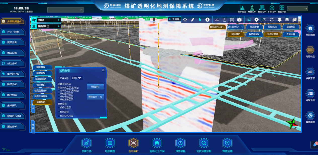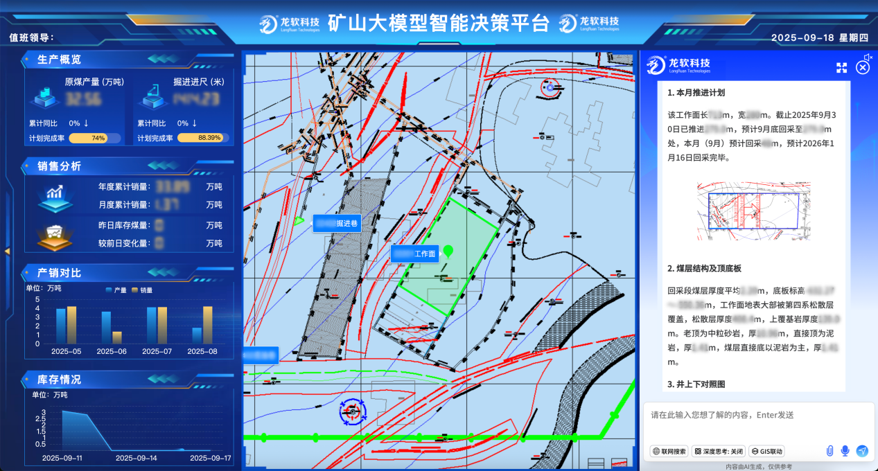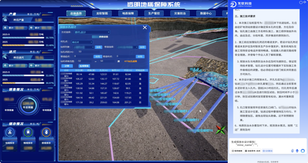 該平臺實現了數據、圖形和模型的一體化處理,支持煤礦地質、測量、通防、機電、生產等專業自動成圖、同步建模和時空信息的高度共享和動態處理,有效破解了長期困擾行業的包括地質建模與更新在內的“卡脖子”關鍵技術難題。系統兼具的技術先進性與場景實用性,創新實現了時空信息云服務,在實現時空信息云服務的同時,深度融合了龍軟科技多年積累的煤礦GIS專業化應用成果,不僅全面推動了礦山安全生產業務的數字化轉型,更以高精度三維模型為支撐,為煤礦智能采掘、智能通風和災害預警提供了堅實的技術底座與可視化決策平臺。