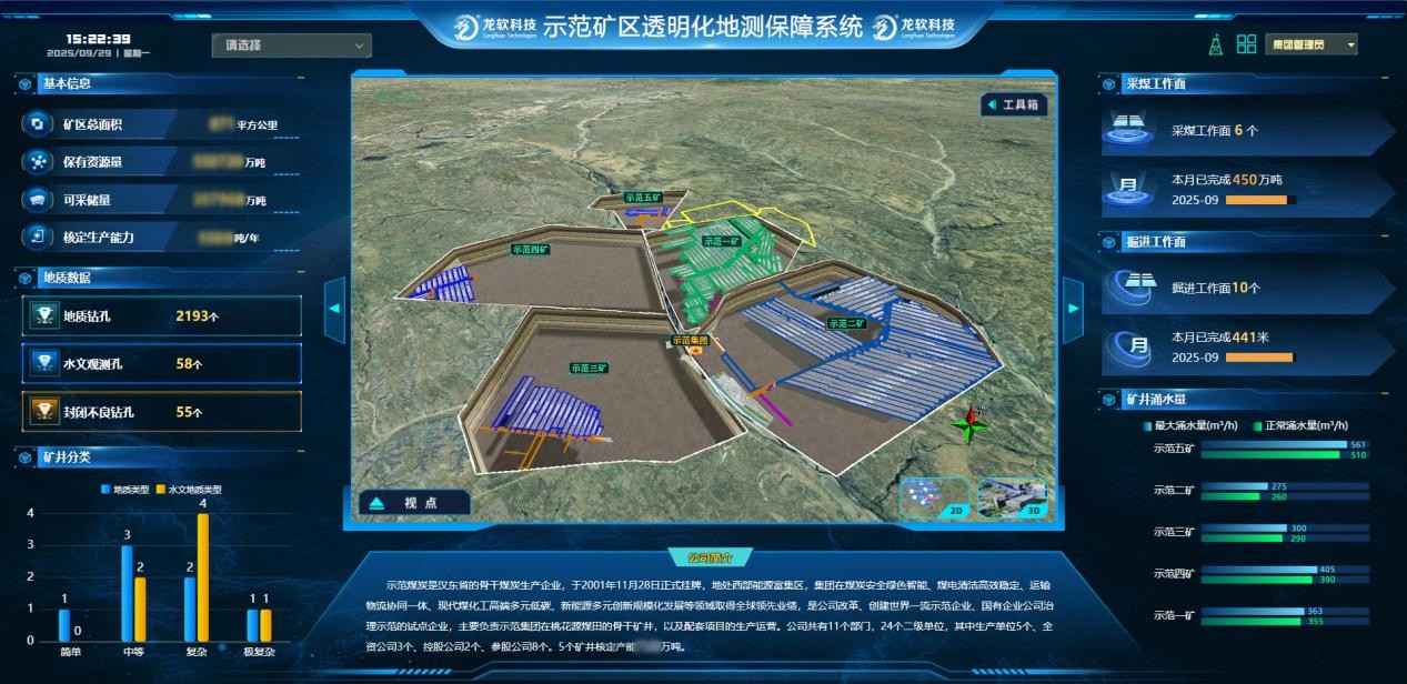 其中,基于云GIS平臺建設的神東礦區透明地質保障系統項目,緊密圍繞神東煤炭集團“13礦14井”生產實際需求,聚焦地測防治水、采礦設計、供電設計、一通三防和煤礦智能化透明地質保障的核心應用場景,依托龍軟科技自主研發的國內外首個礦山多維云GIS平臺,構建了覆蓋“工作面—礦井—礦區”的二三維一體化、多維多屬性、可動態更新的地質模型與三維場景,首次在礦區層面實現了地質信息和隱蔽致災因素的數字化、透明化和多終端管理,徹底改變了煤礦地測、設計、一通三防等工作數據的傳統處理模式,推動礦山技術應用實現了從二維圖形向三維模型、從分散處理向在線協同的跨越升級。