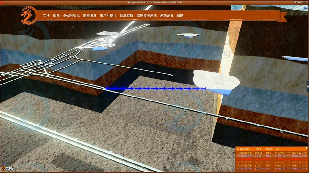 ( 6)地質大數據分析與隱蔽致災預警報警分析和預警平臺。基于龍軟云平臺,對煤礦地層、構造、煤層、煤質、瓦斯、水文和其它地質條件、地質特征及其變化規律進行可視化智能分析,實現隱蔽致災因素(水害、瓦斯、沖擊地壓等)的預測預報,基于巷道、地層和生產的時空關系,進行危險源的遠程可視化智能預警。
